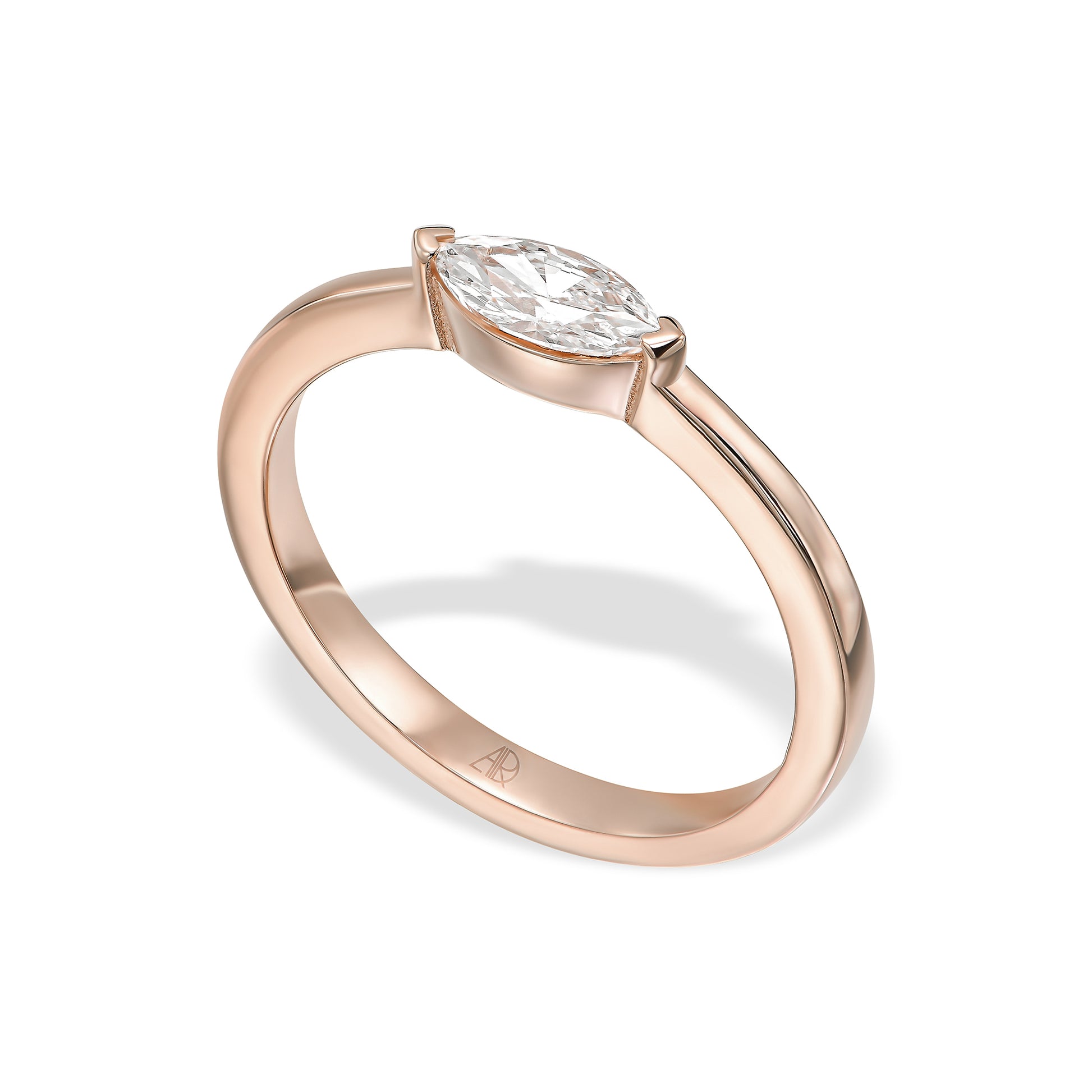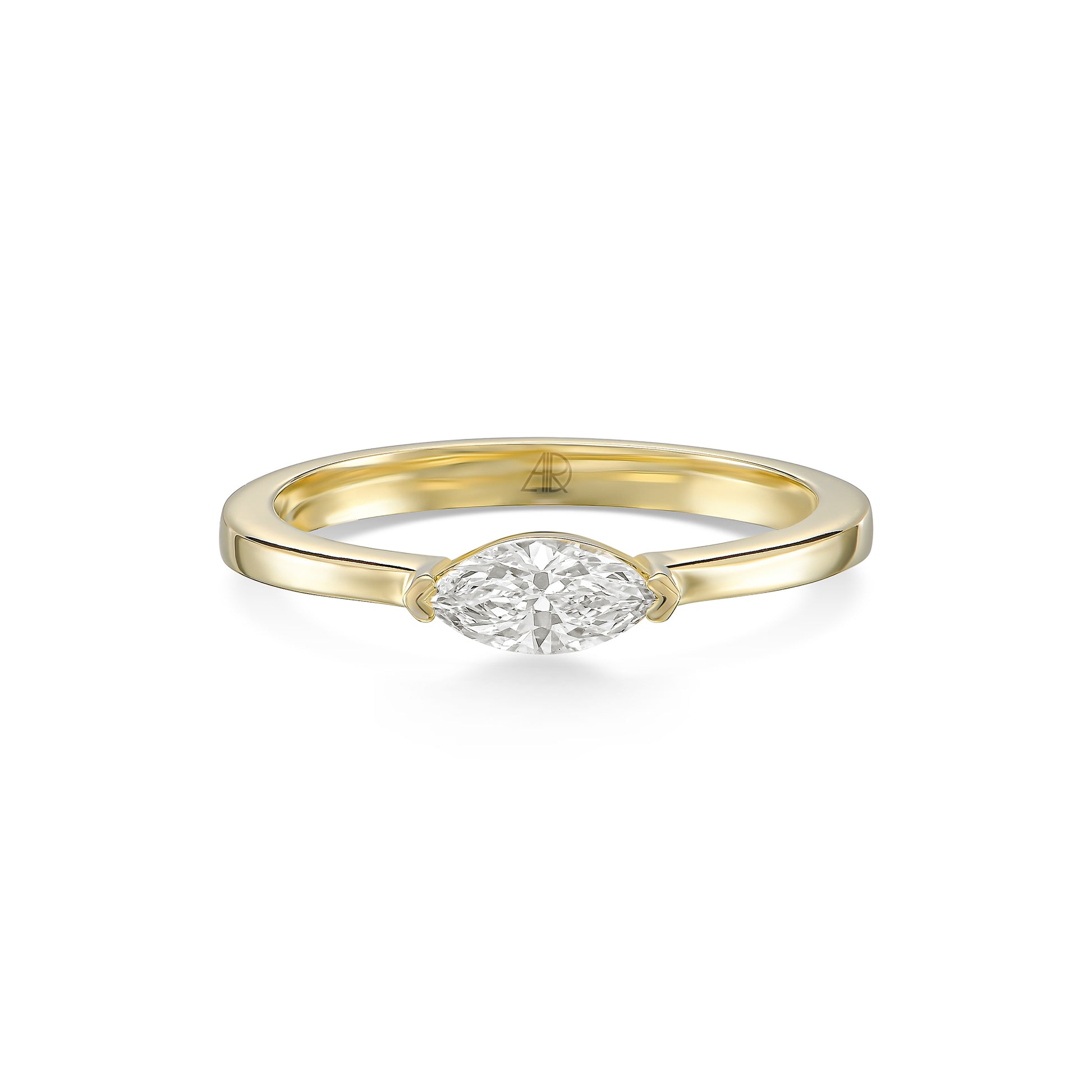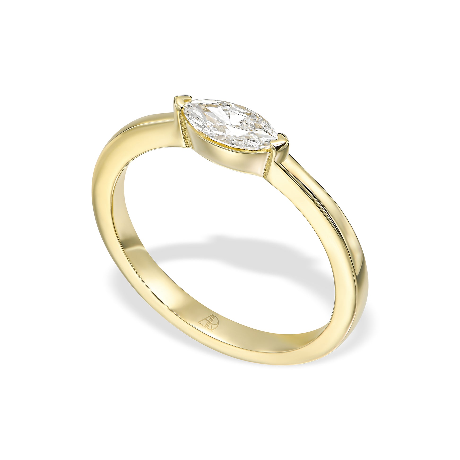 טבעת אליה מעוצבת סביב יהלום מרקיזה יחיד משובץ לרוחב, ליצירת קו אסתטי נקי וייחודי.