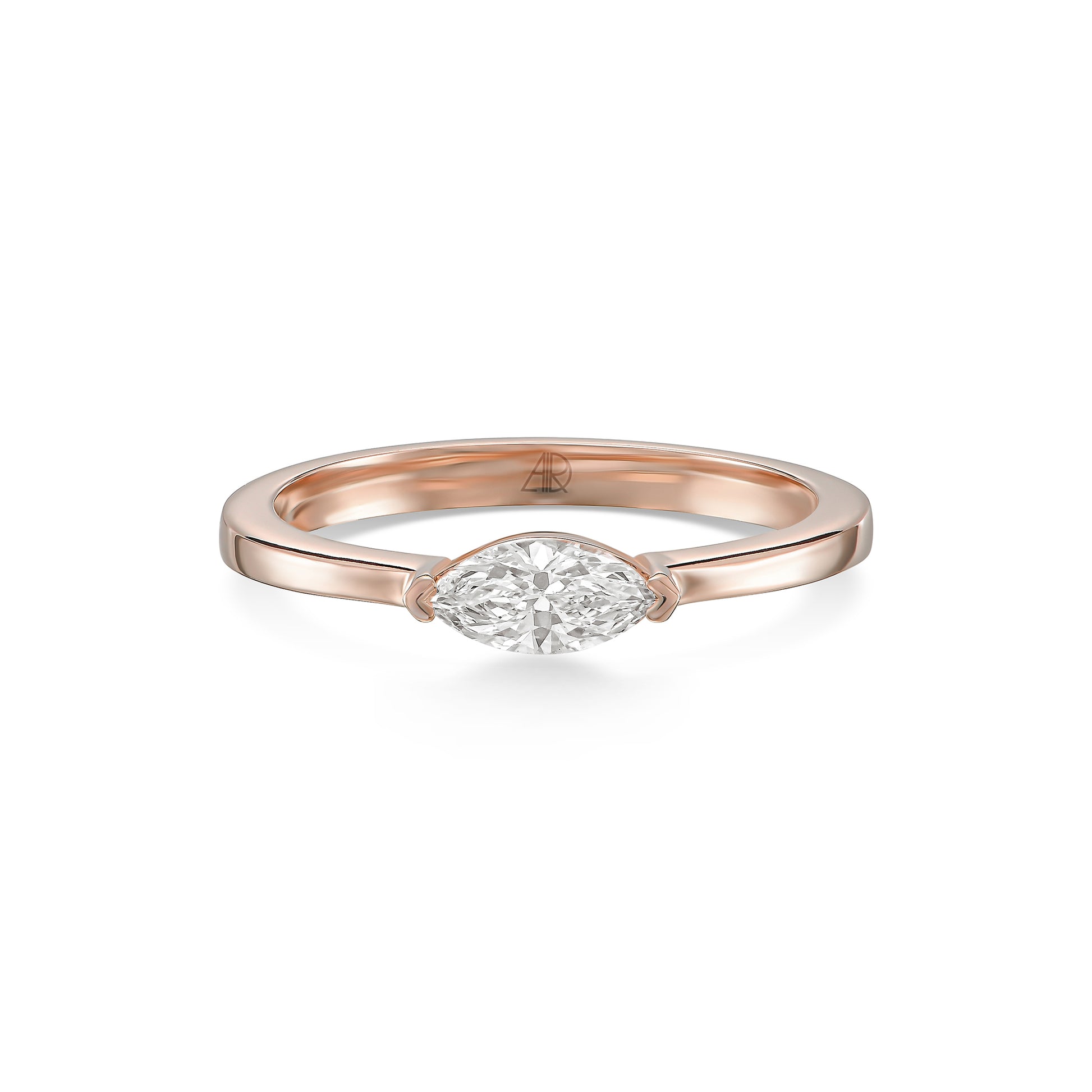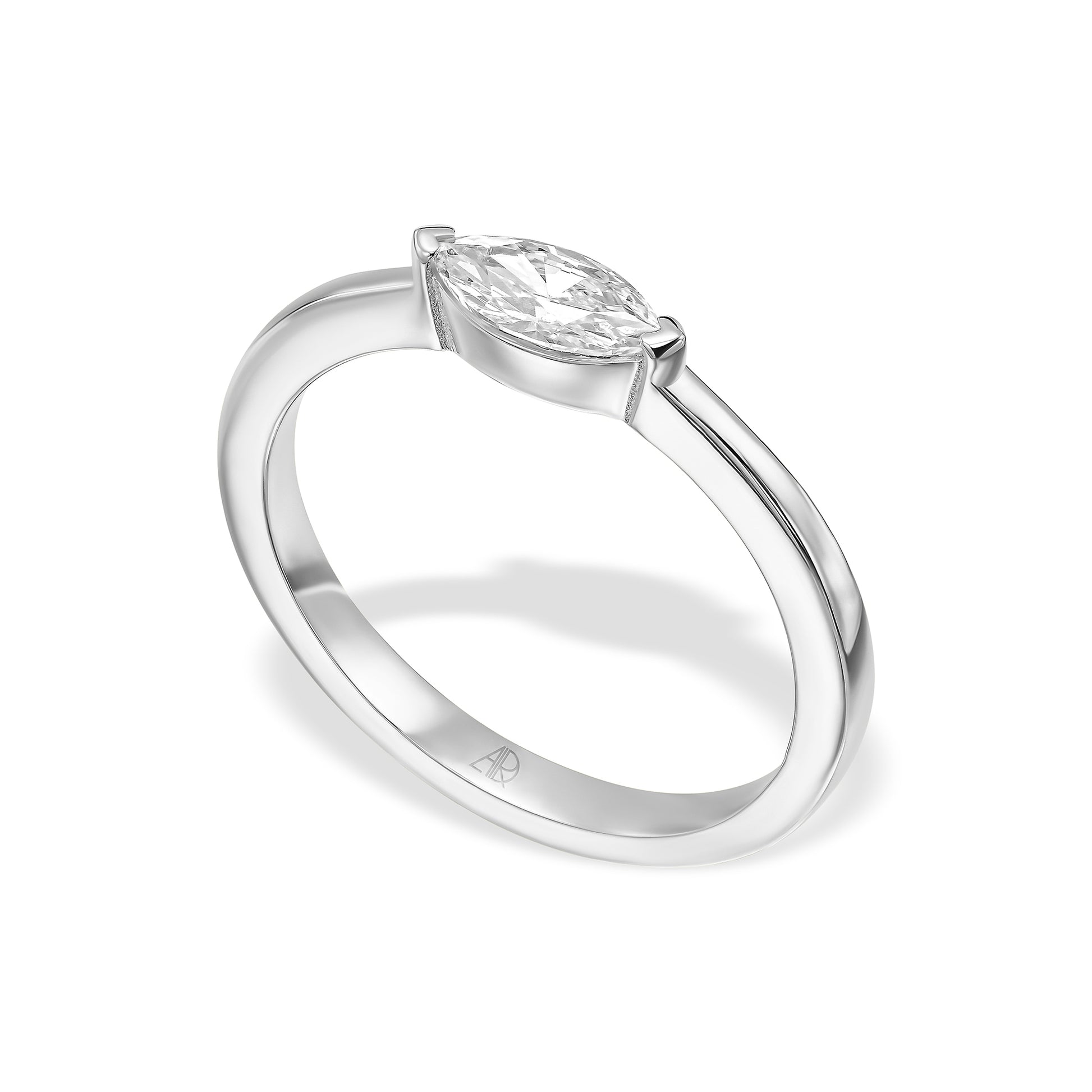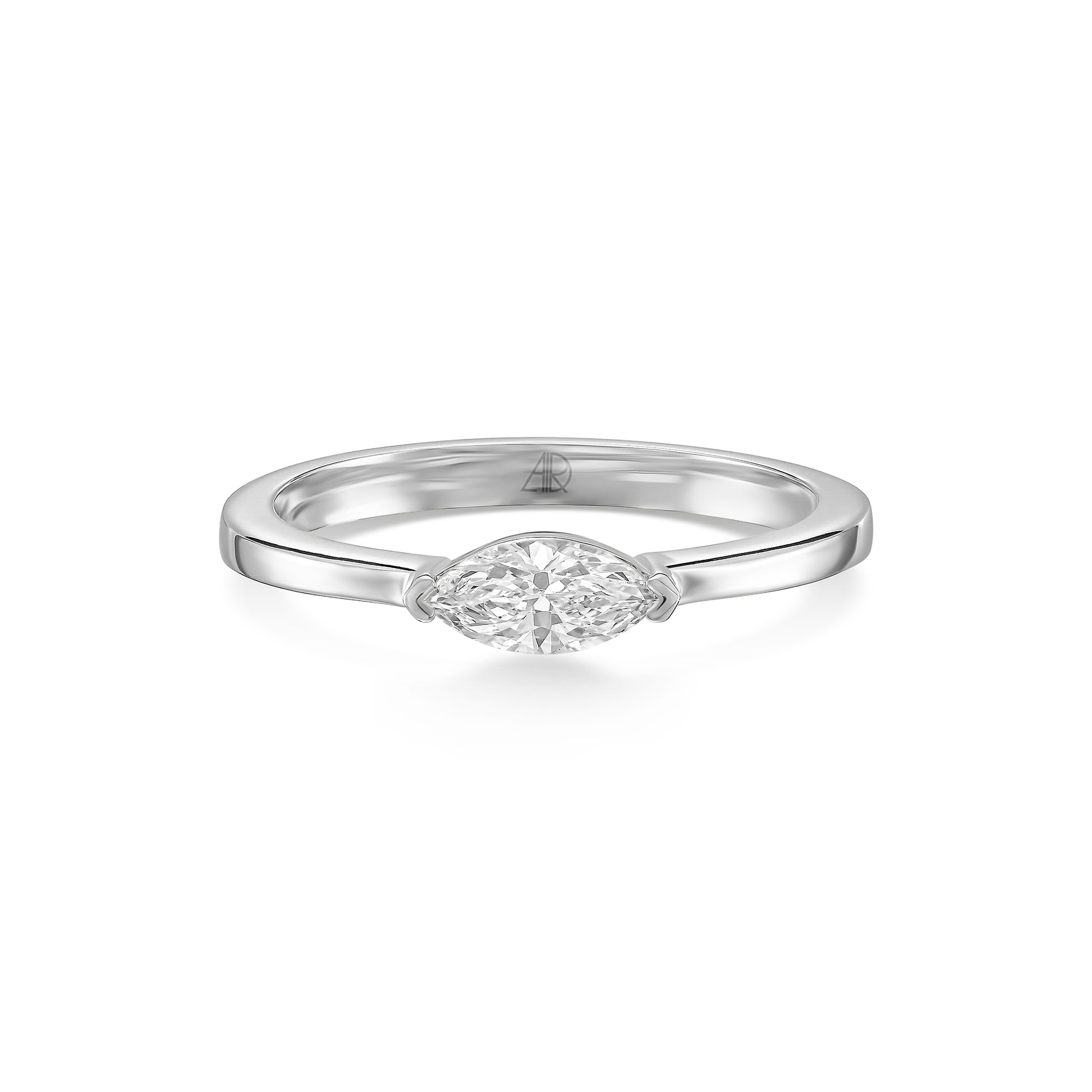 טבעת אליה מעוצבת סביב יהלום מרקיזה יחיד משובץ לרוחב, ליצירת קו אסתטי נקי וייחודי.