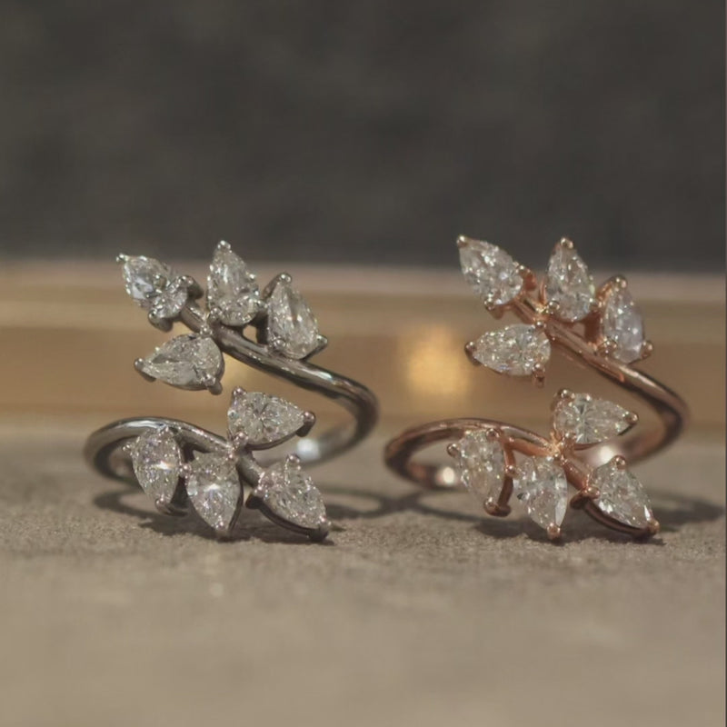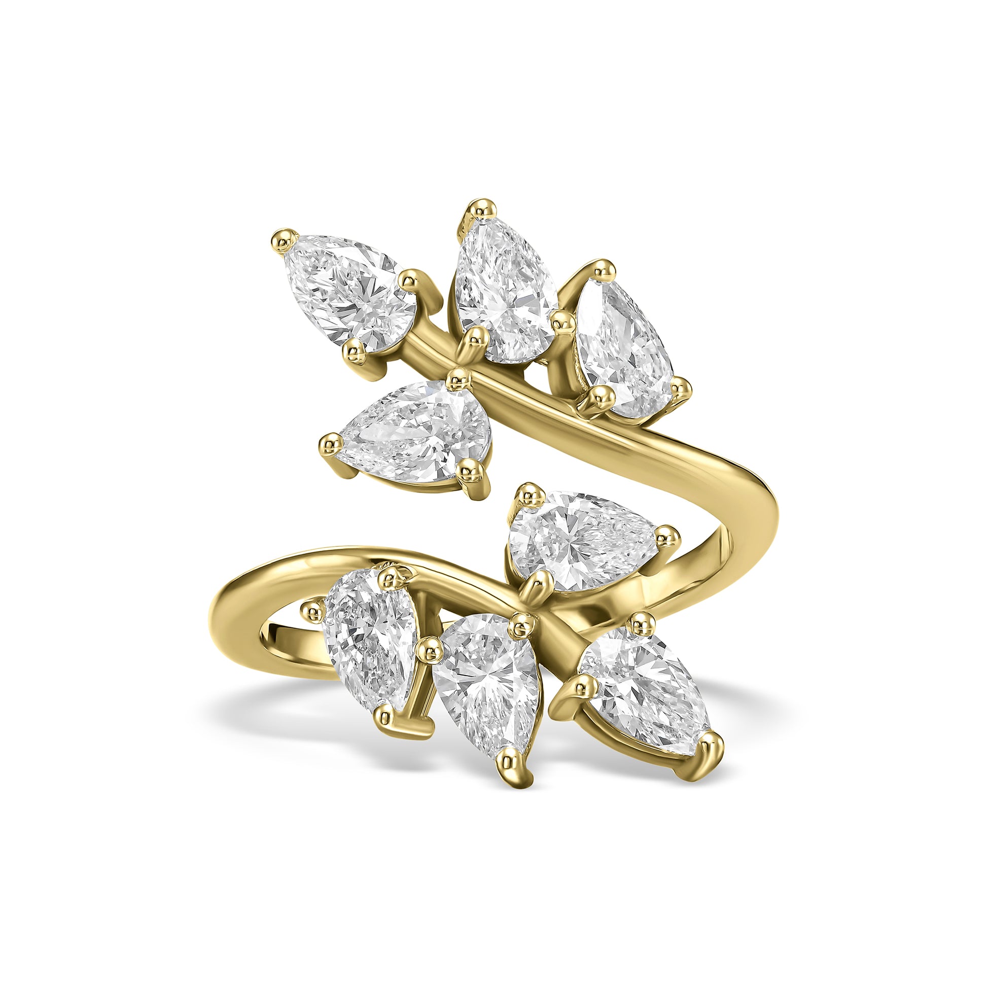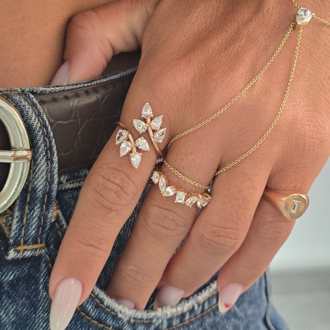טבעת גפן שואבת השראה מתנועת הטבע והאלגנטיות שבצמיחה. מעוטרת ביהלומים בצורת טיפה, המשתלבים זה בזה בהרמוניה מושלמת ממש כמו עלי גפן עדינים הנפרסים סביב האצבע.