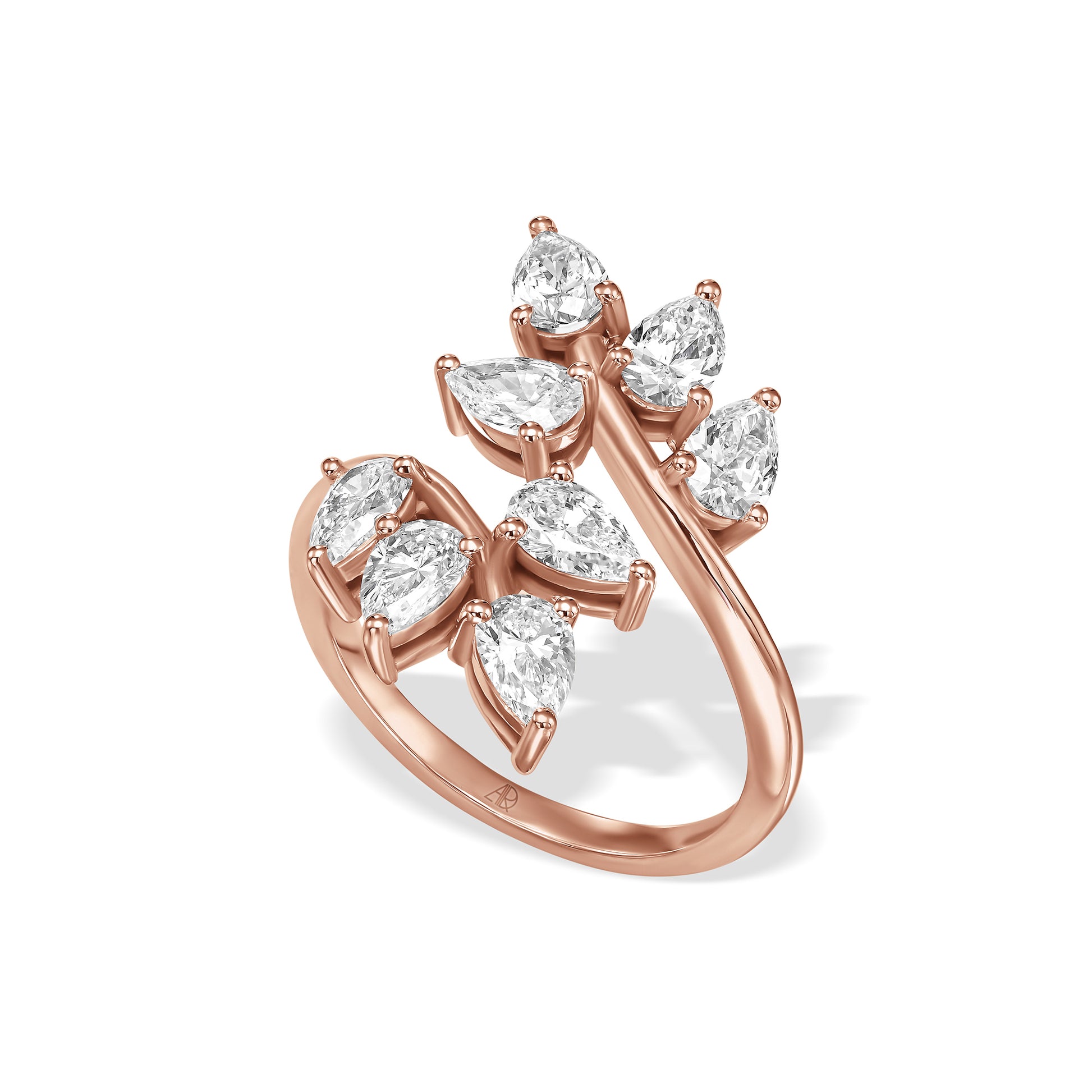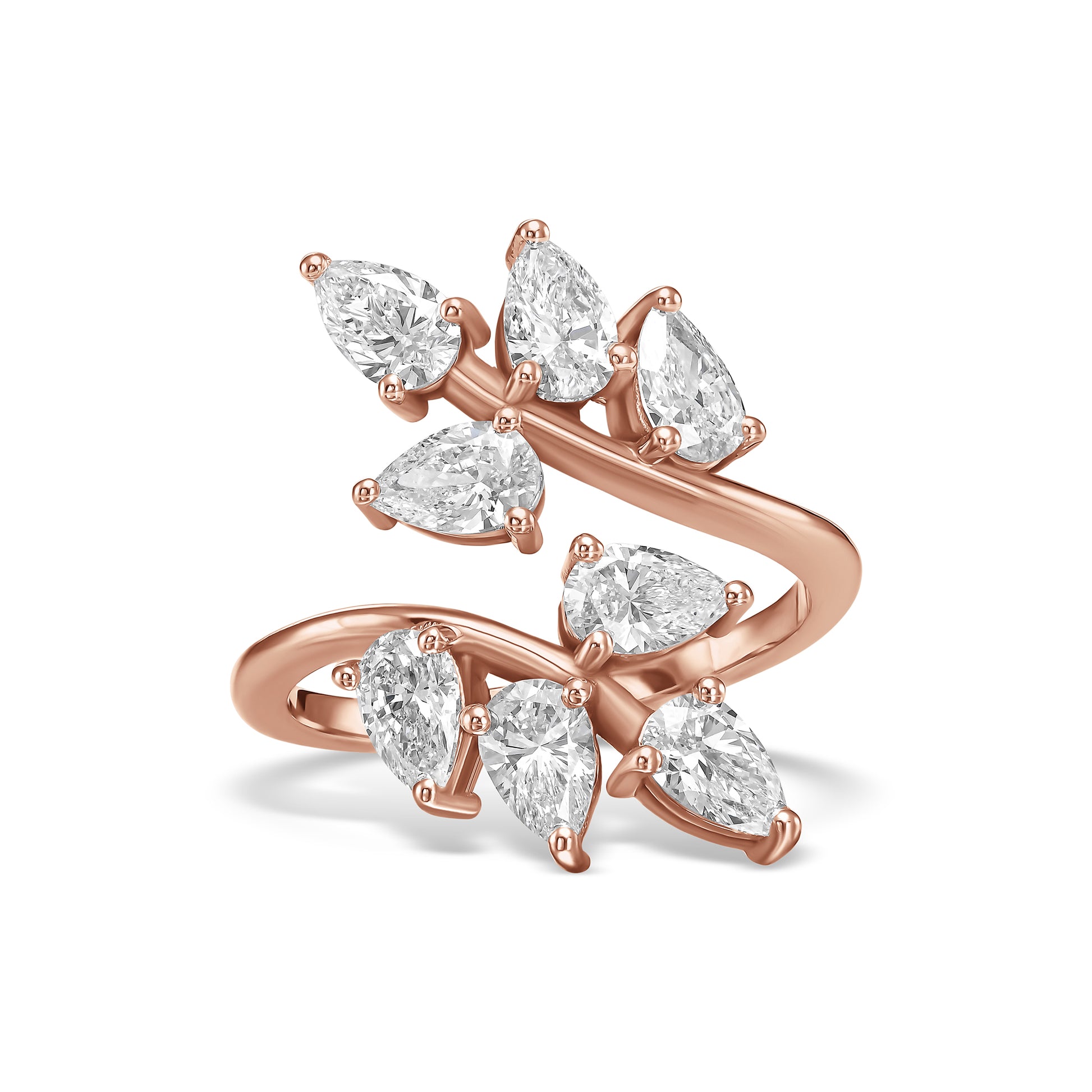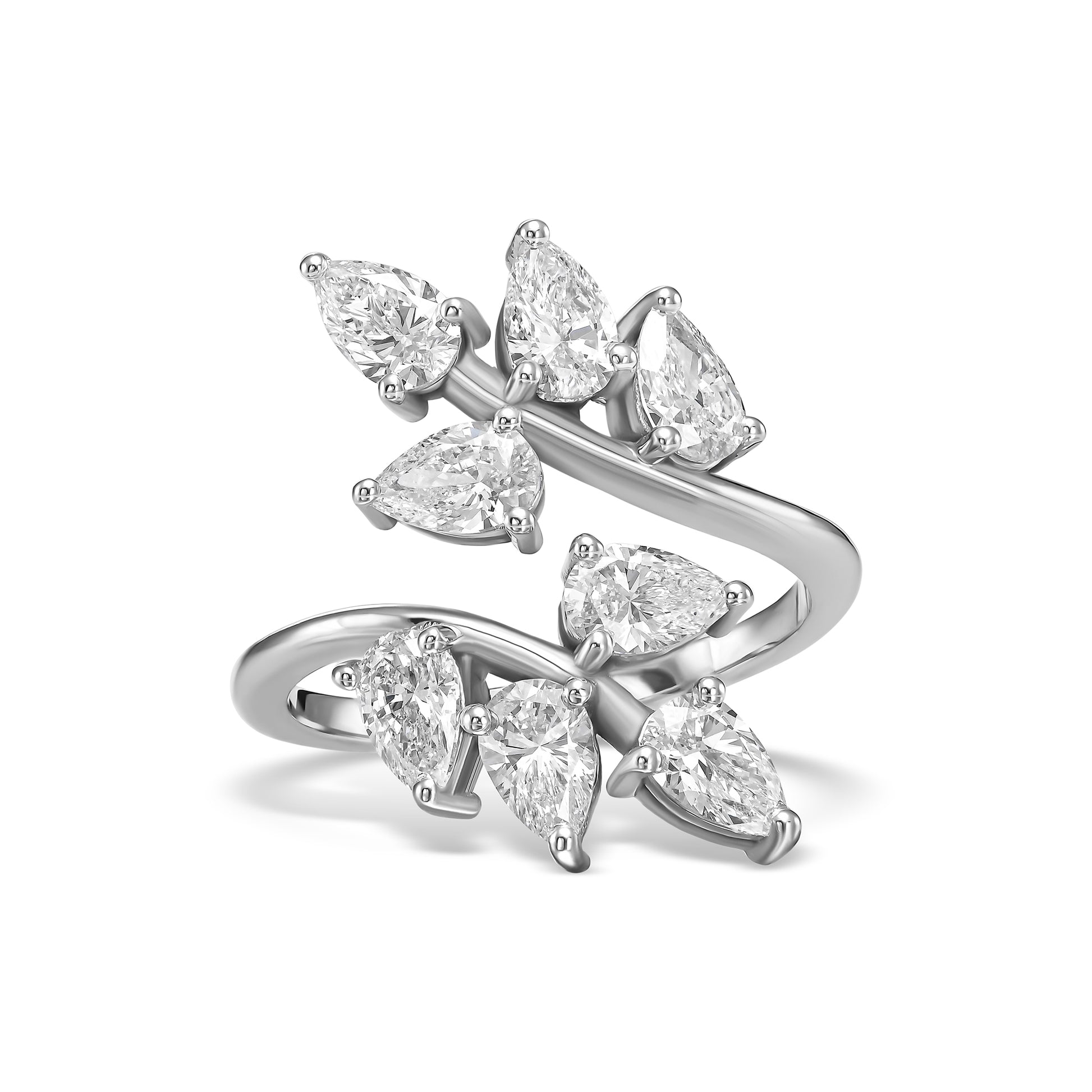 טבעת גפן שואבת השראה מתנועת הטבע והאלגנטיות שבצמיחה. מעוטרת ביהלומים בצורת טיפה, המשתלבים זה בזה בהרמוניה מושלמת ממש כמו עלי גפן עדינים הנפרסים סביב האצבע.