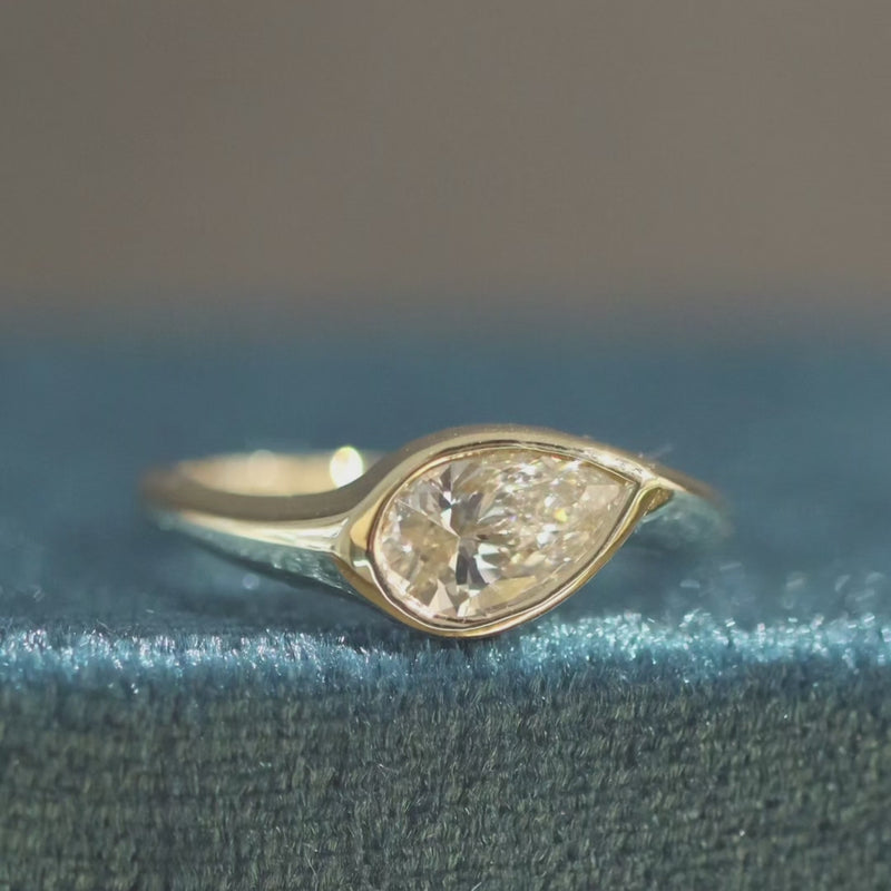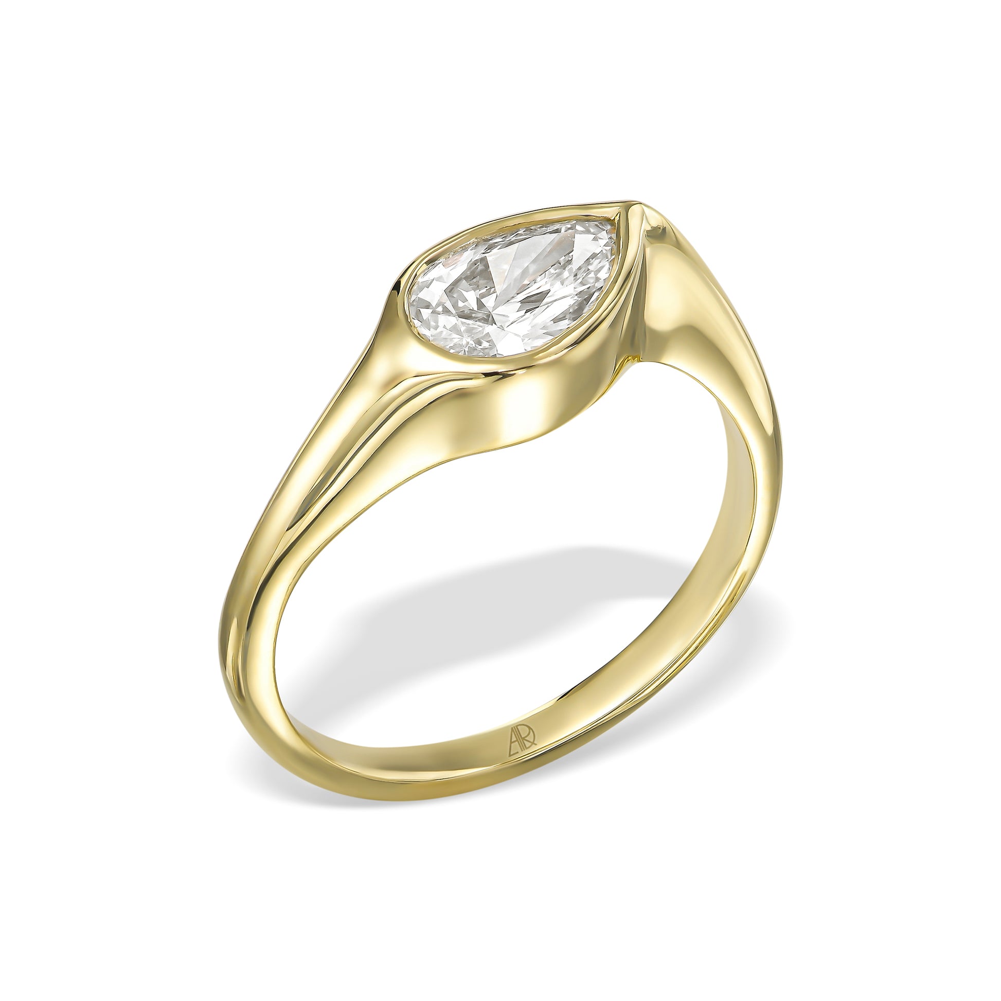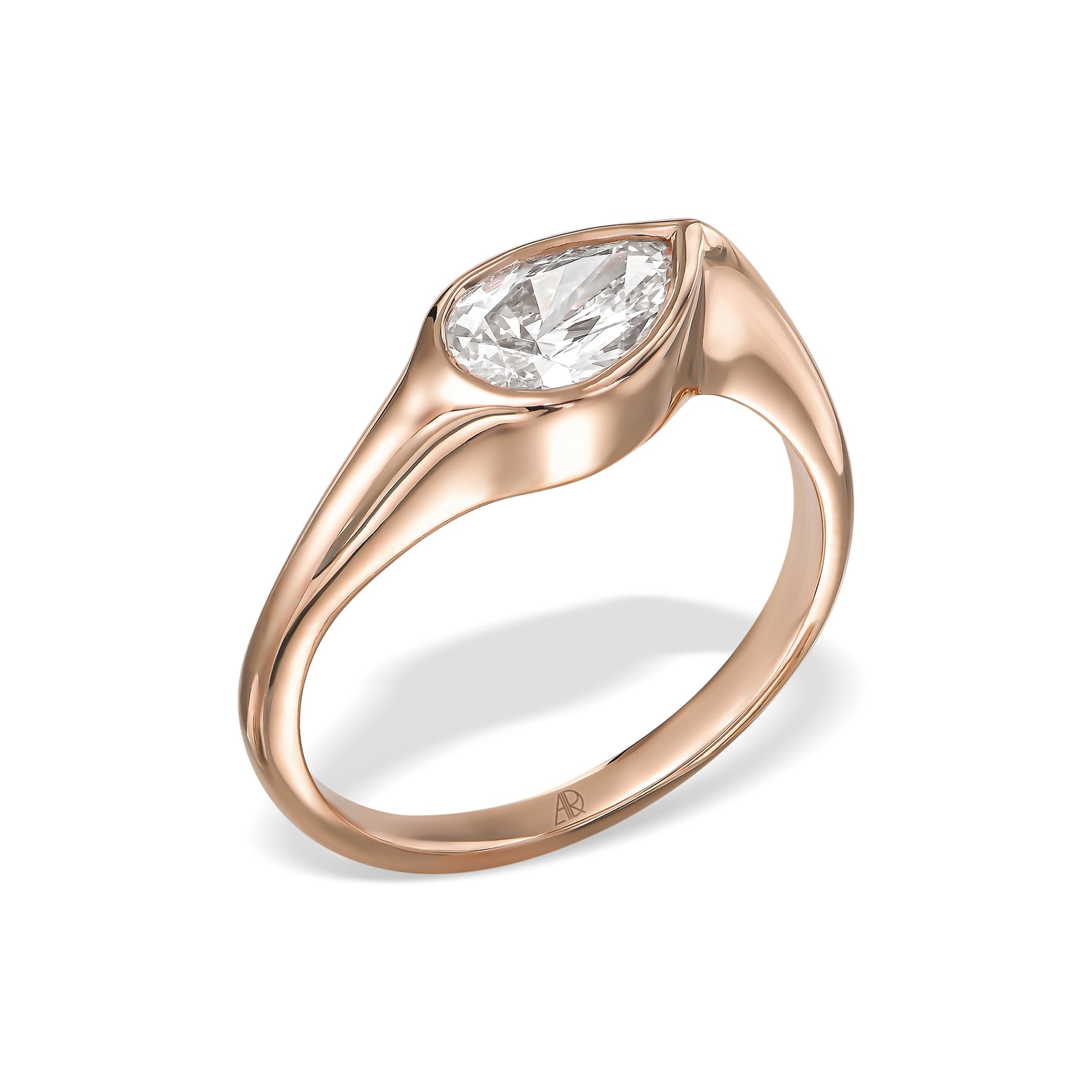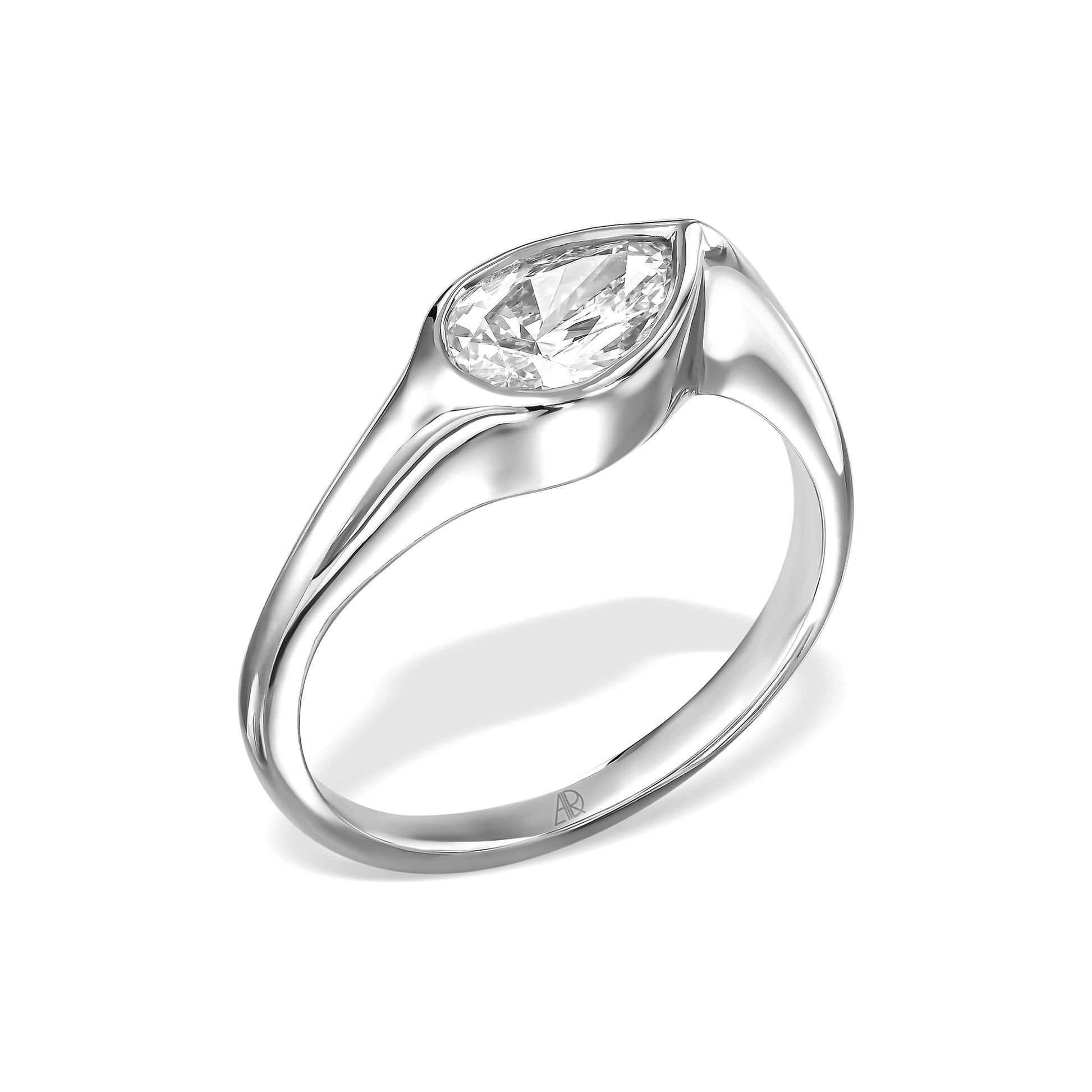 טבעת טוהר בעיצוב מודרני וזורם שמלטף את האבן מכל כיוון.