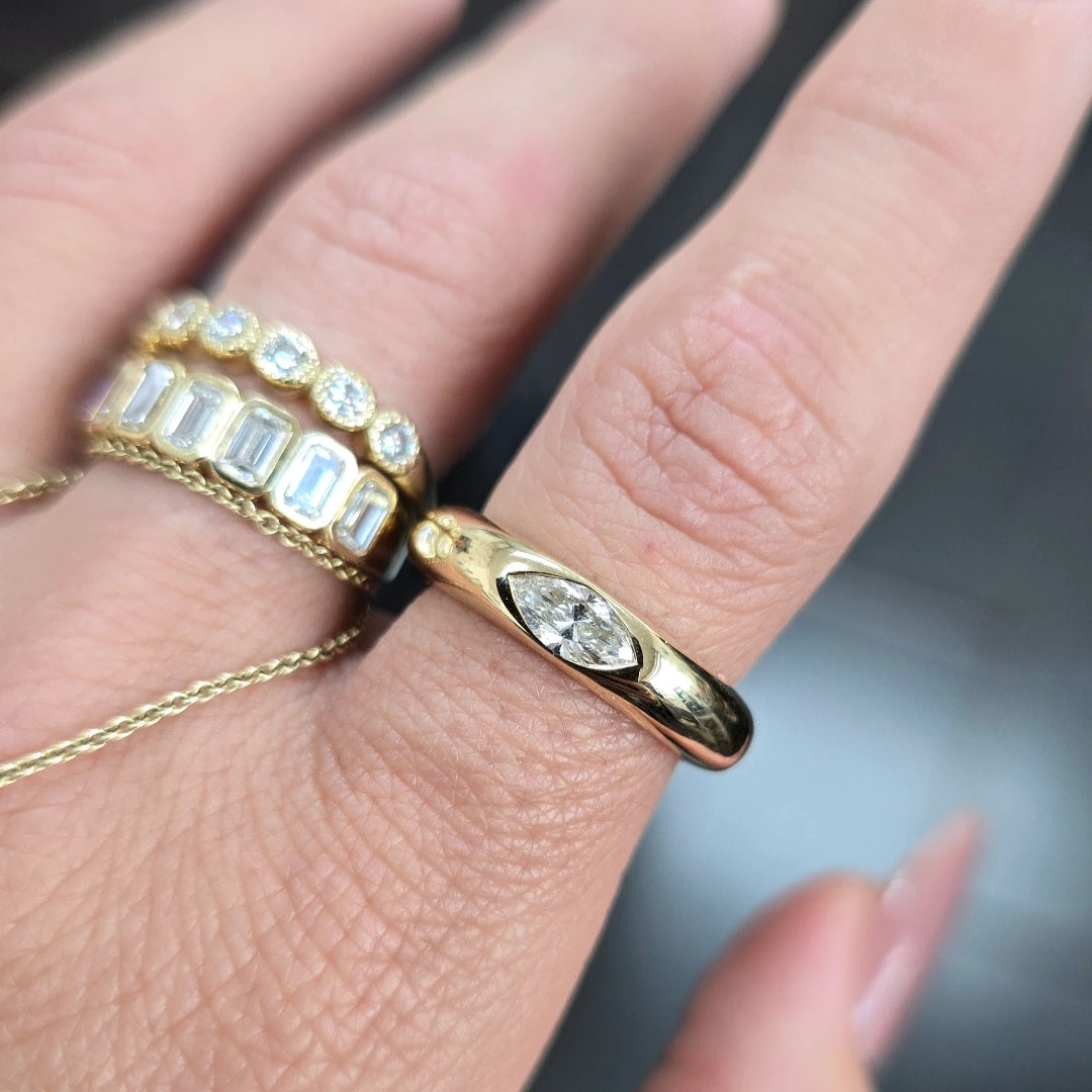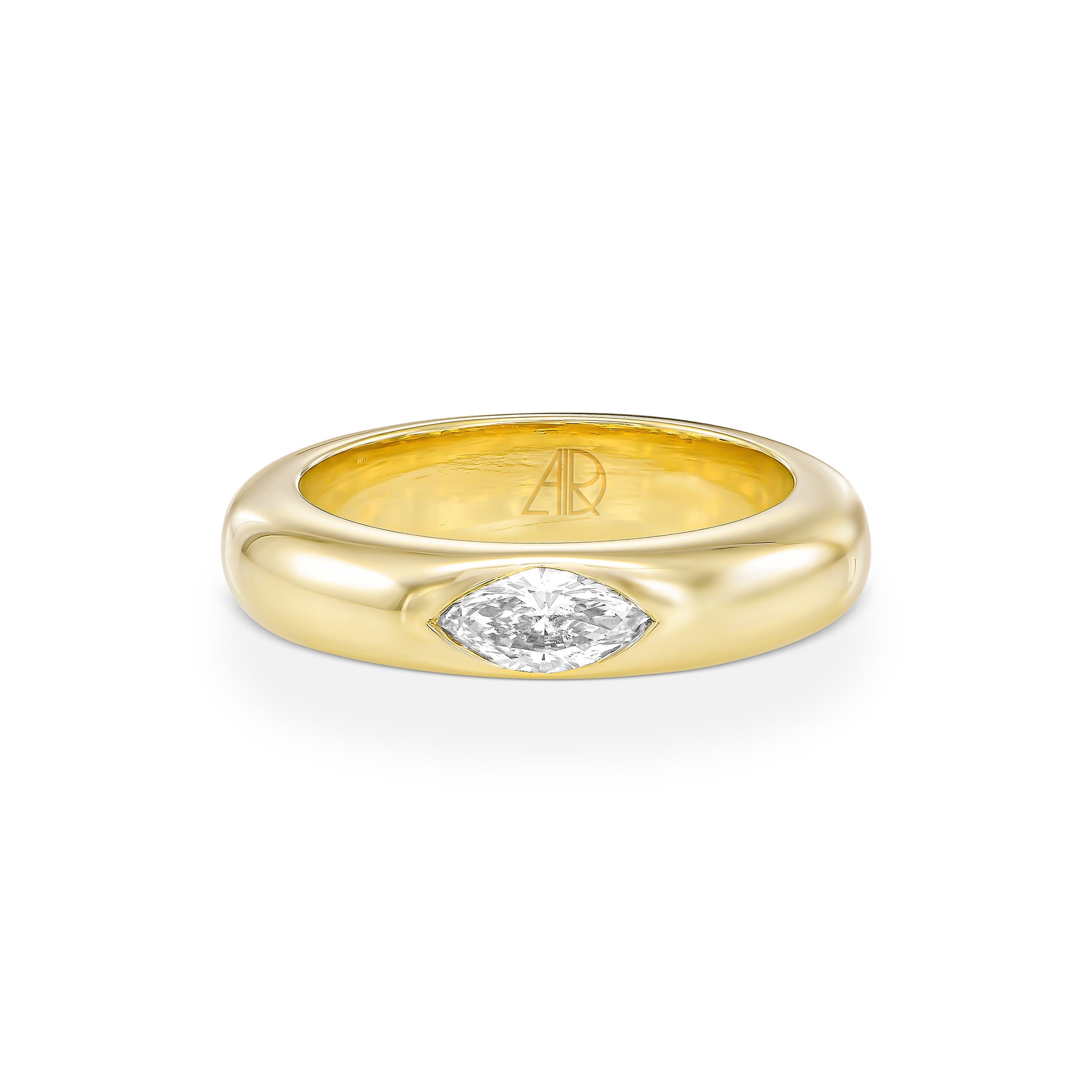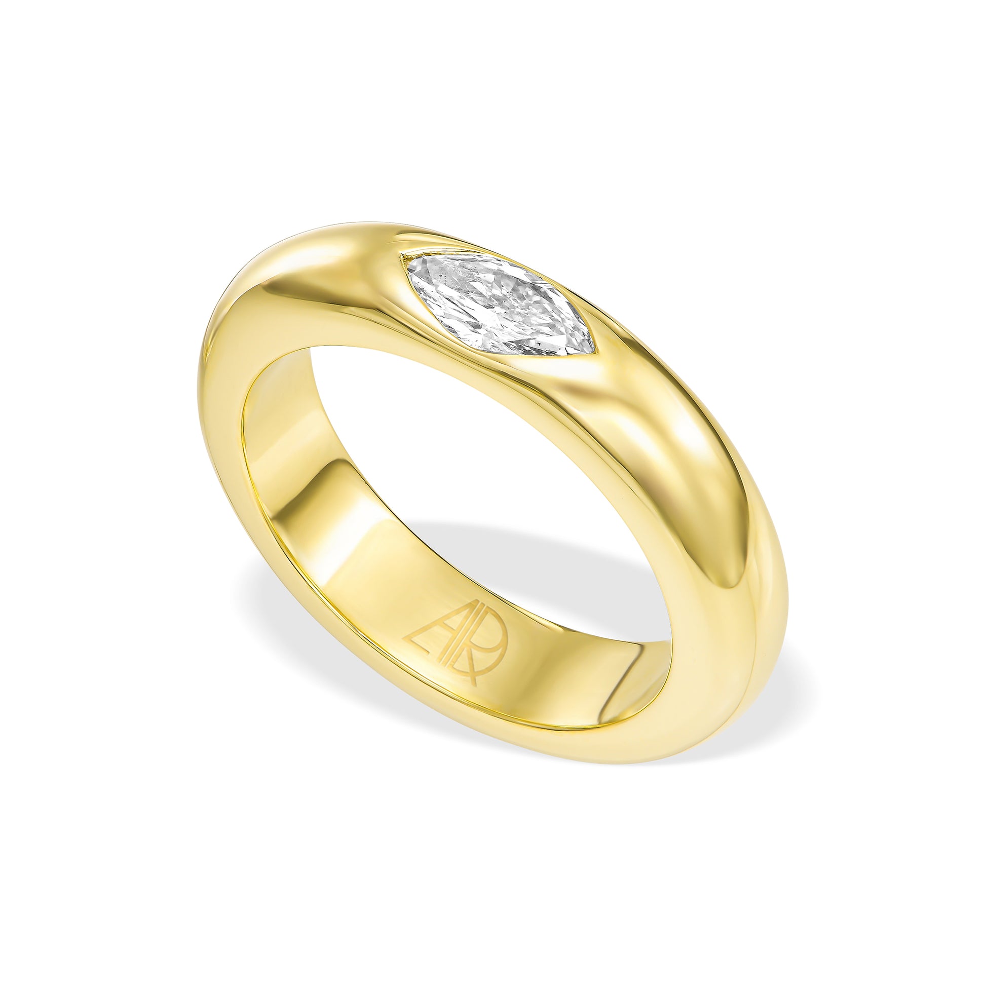 טבעת טל היא טבעת זהב נקייה וחזקה, עם יהלום מרקיזה משובץ בעדינות בתוך גוף הטבעת.