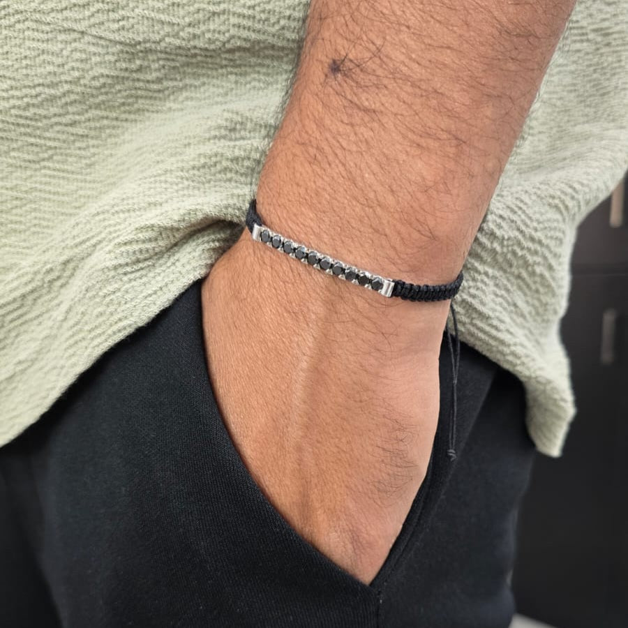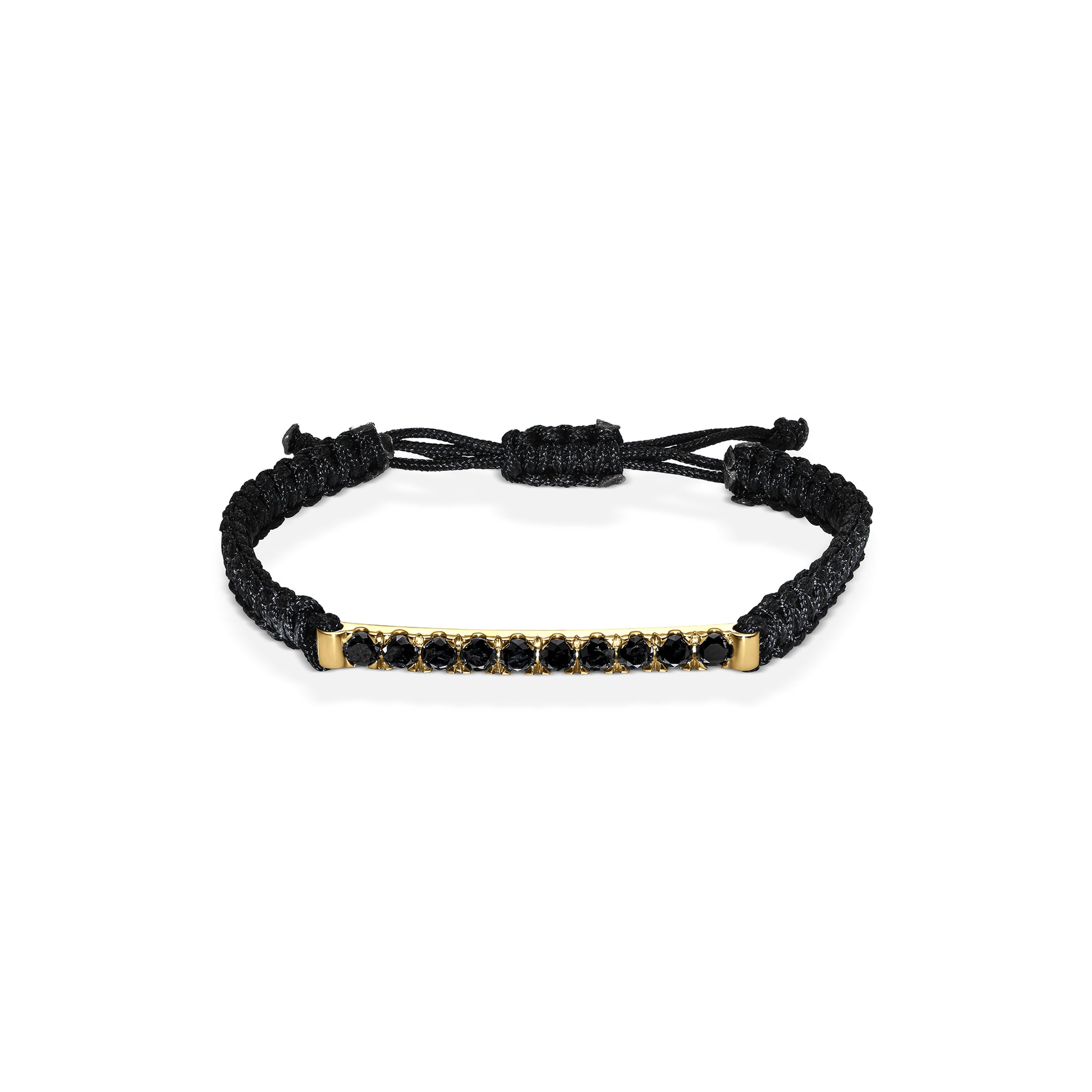 פס זהב עדין ונקי, משובץ יהלומים שחורים על חוט שזור בעבודת יד שילוב שמספר סיפור של איזון, עוצמה ורוך, דיוק ופשטות, זהב ואור. צמיד שהוא הצהרה שקטה של סגנון, ביטחון ונשמה חופשית.